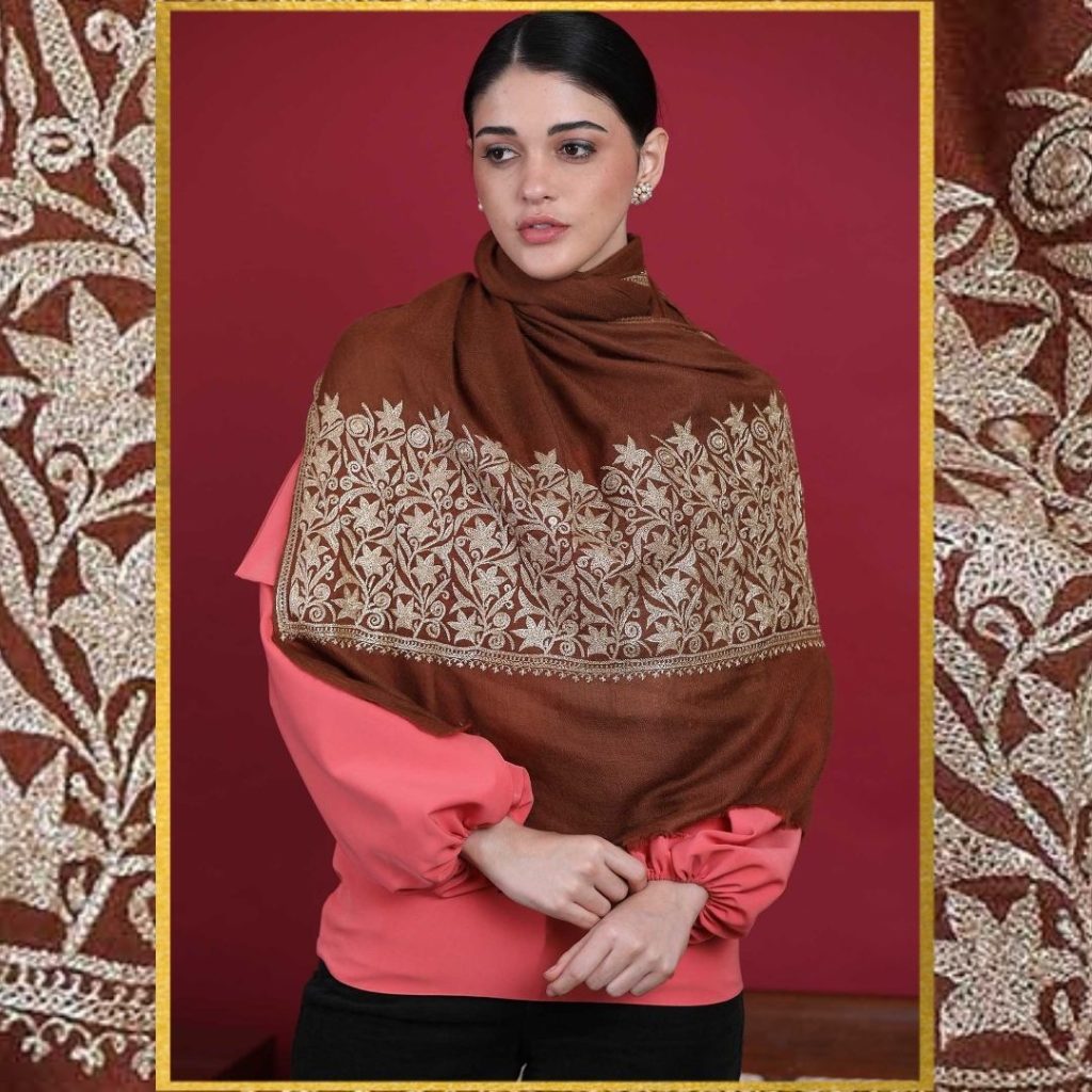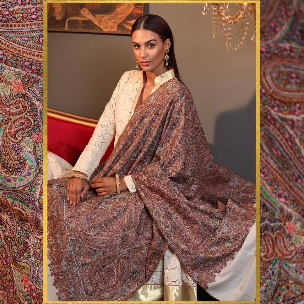 The balletic gaze of the intricate hand embroidery illicitly defines the charms of the Pashmina shawls